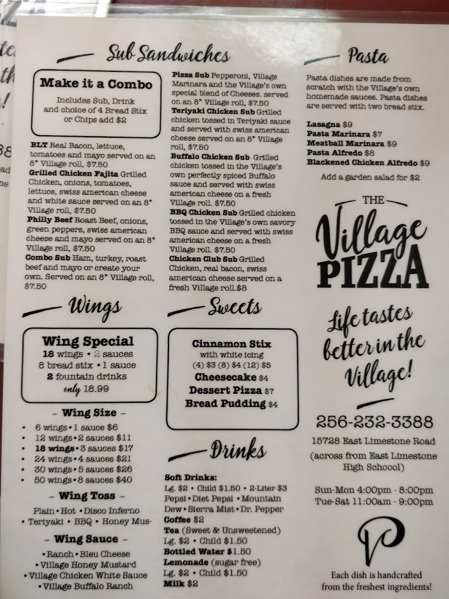 Welcome to Village Pizza Athens, where flavorful dishes and a warm atmosphere invite you to savor every moment. Located at 15728 E Limestone Rd, Athens, AL, this beloved pizza shop is cherished by both locals and visitors alike.